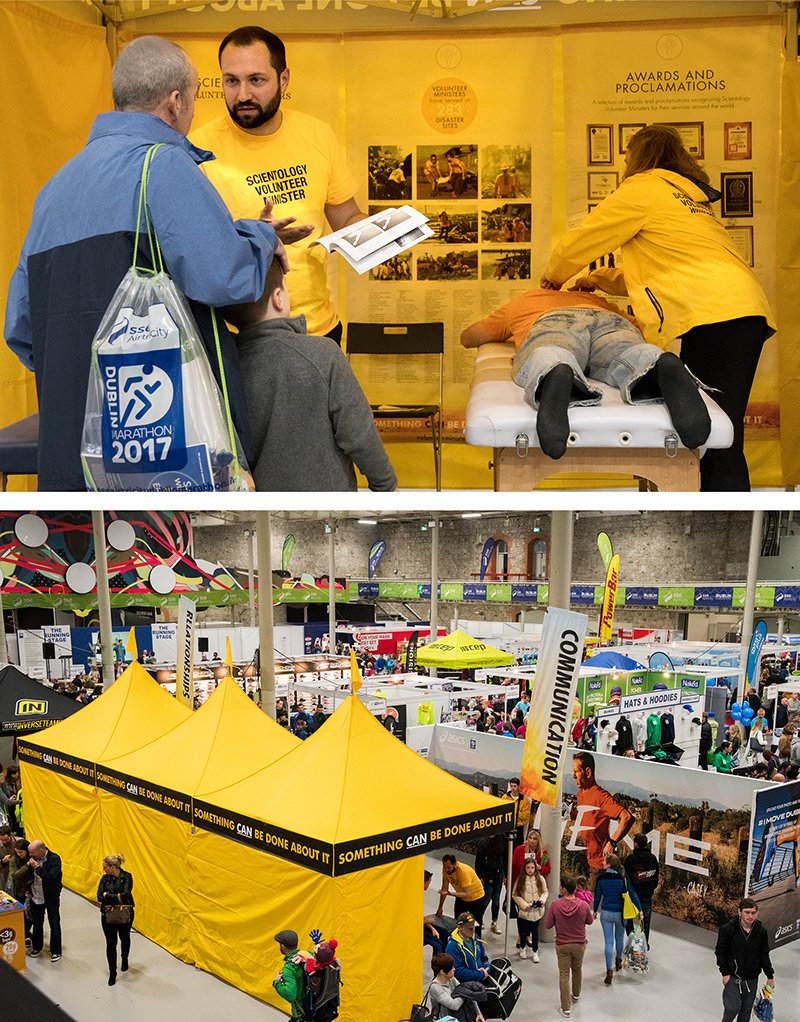 Como parte da recente Maratona da Expo de dois dias em Dublin, Irlanda, foi montada uma tenda dos Ministros Voluntários no Royal Dublin Society Hall, onde os VMs apresentaram as Ferramentas para a Vida de Scientology à comunidade, deram Ajudas e responderam a muitas perguntas.